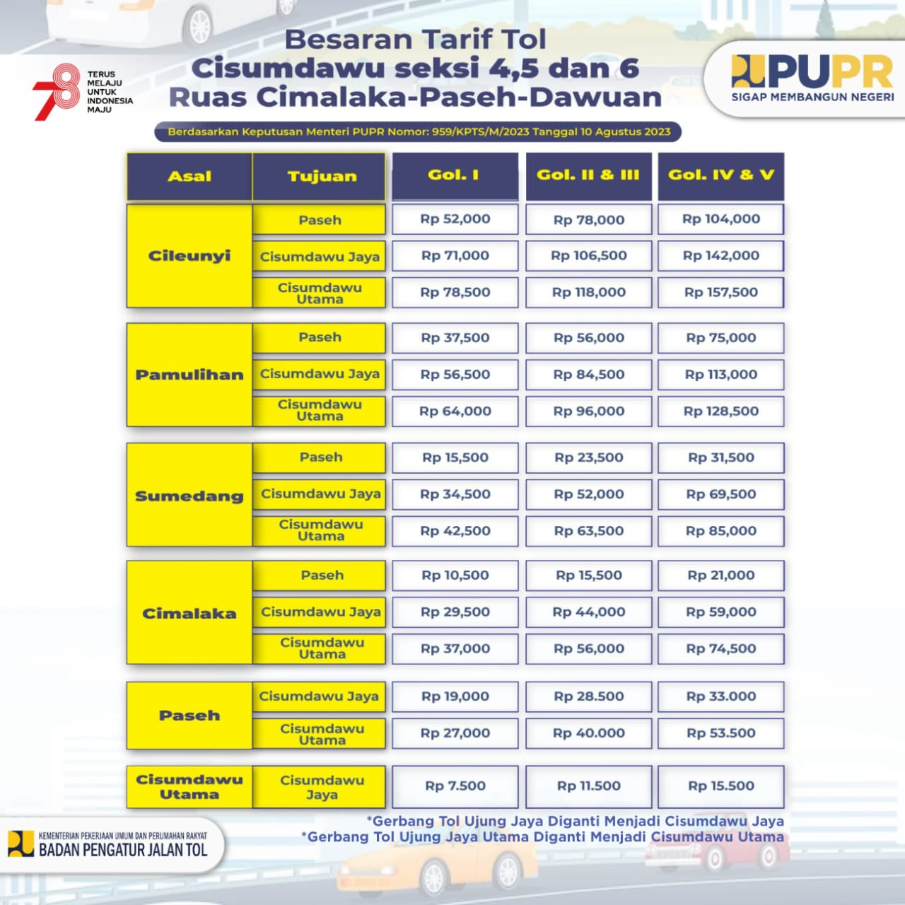 #SobatBPJT – Saat ini keseluruhan Jalan Tol Cileunyi – Sumedang – Dawuan (Cisumdawu) dari Cileunyi hingga Dawuan mulai bertarif.